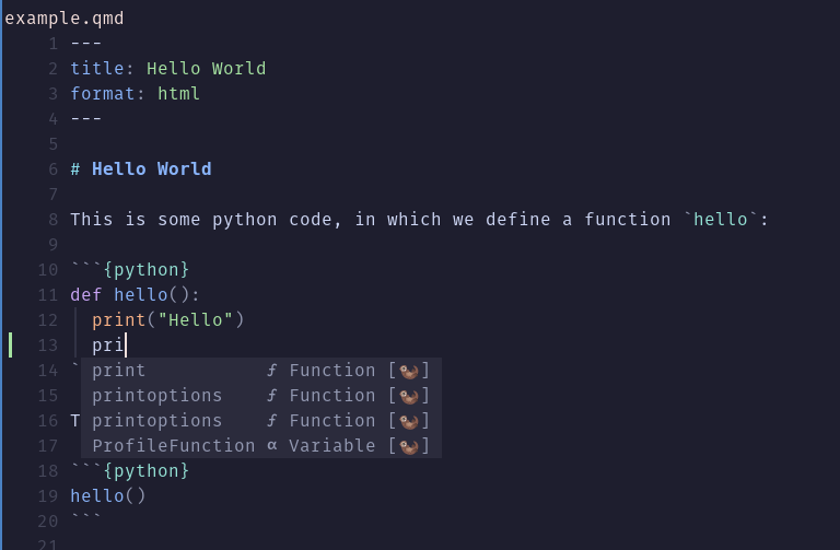 Vim is famously good at letting you navigate documents quickly. Here, we only have a look at some additional features provided by quarto-nvim. For the full range of options, refer to the documentation of vim/neovim and of the plugins included in the kickstarter configuration.