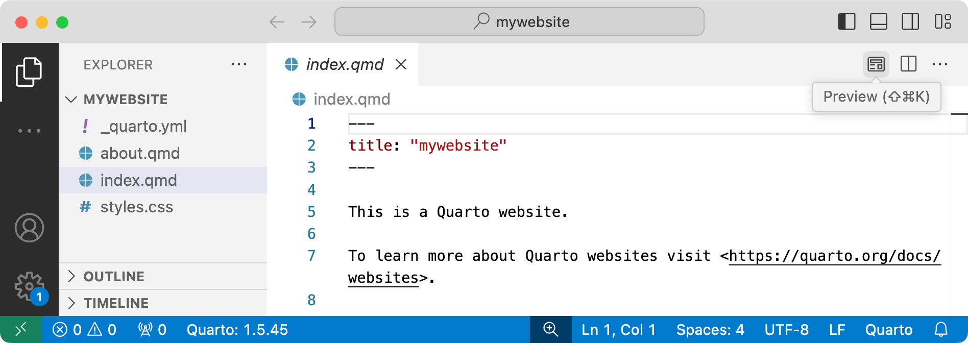 The new website project will be created and opened within VS Code. Click the Preview button (Preview icon) to preview the website: