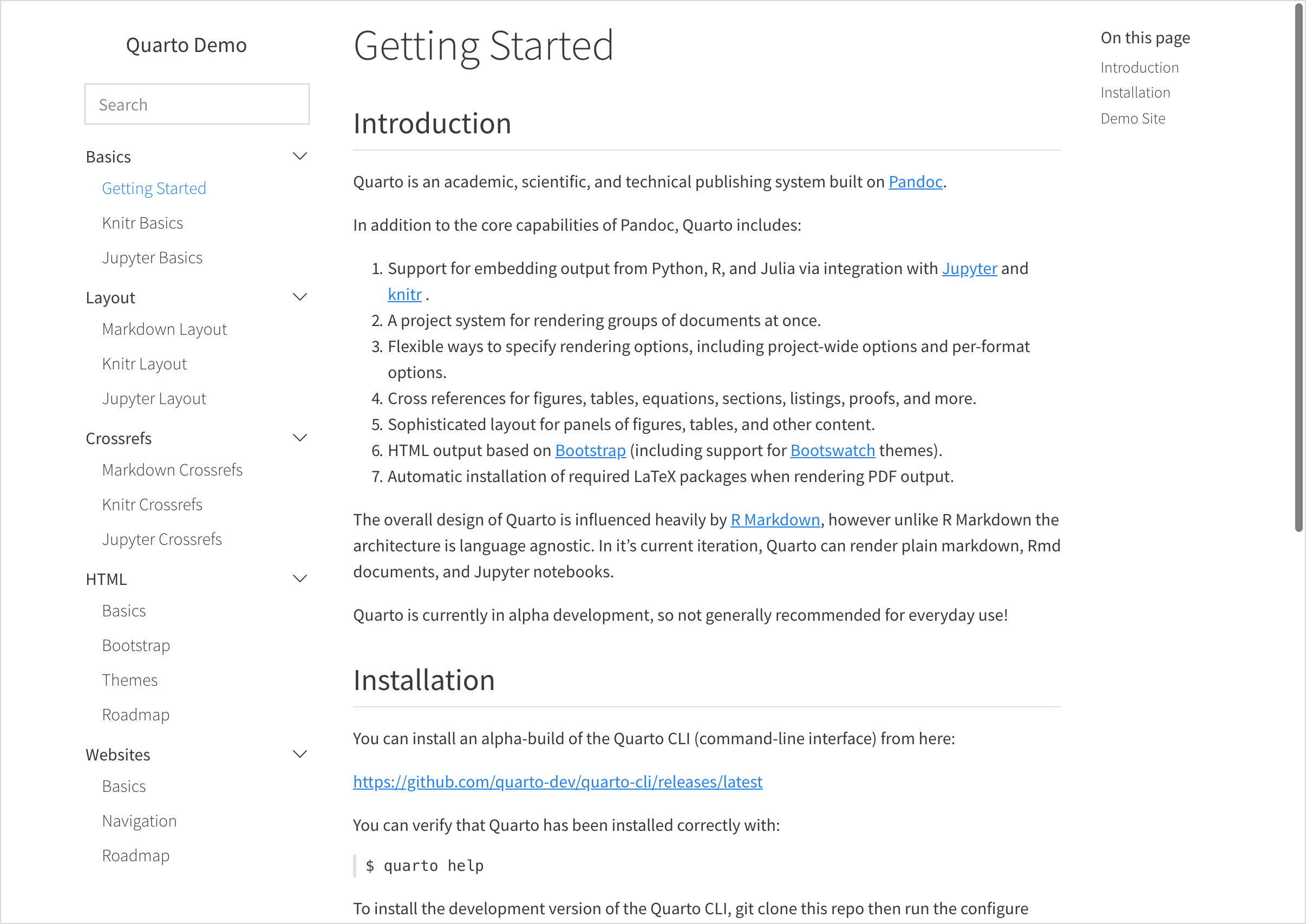 When the user reaches the bottom of document3.qmd, they will see previous navigation to go back to document2.qmd, but they will not see next navigation to continue onto document 4. This behavior is useful when you have sections of contents that don’t naturally flow together in sequential order. Use the separator to denote this in the sidebar with a horizontal line and to break up pagination.