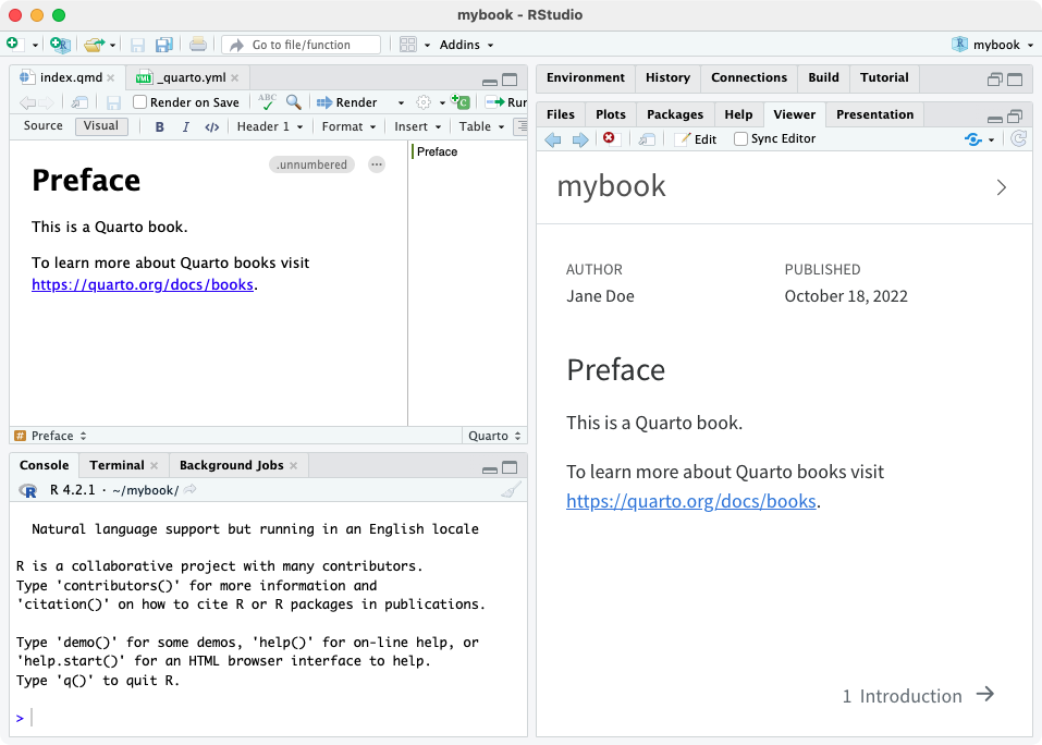 The book preview will open in a new web browser. As you edit and save index.qmd (or other files like intro.qmd) the preview is automatically updated.