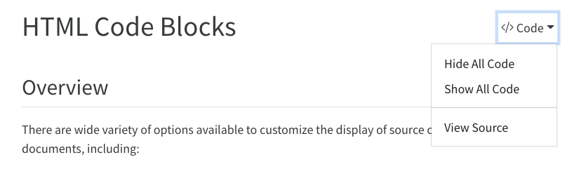 You can include a Code menu in the header of your document that provides various tools for readers to interact with the source code. Specify code-tools: true