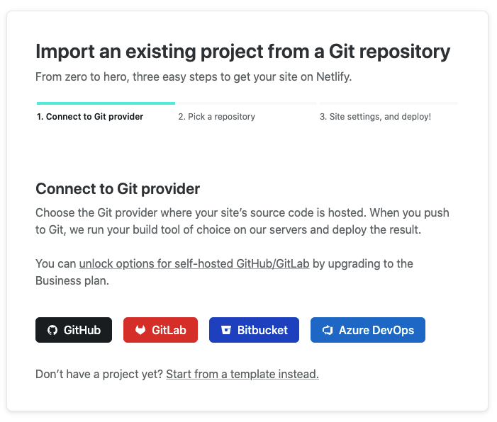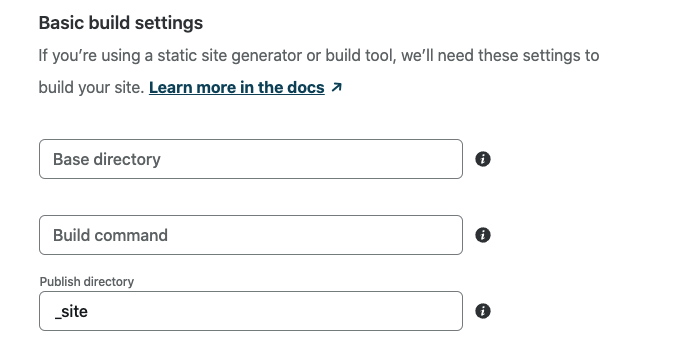 You’ll be prompted to authenticate with your version control provider, select a repository, and then finally specify the configuration for publishing the site.