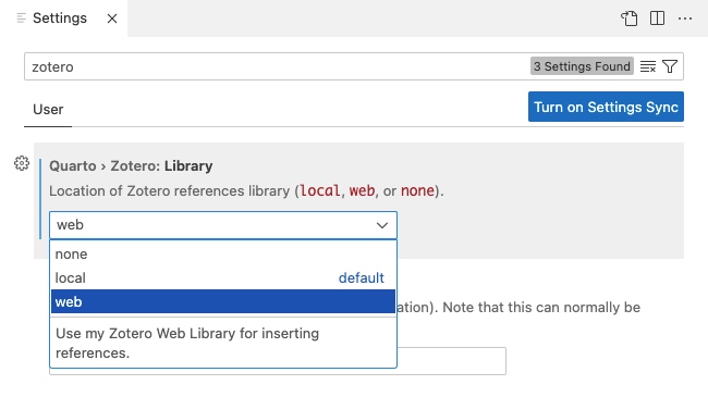 If you are running both VS Code and Zotero on your desktop, then no additional configuration is required for connecting to your Zotero library. If however you using VS Code in a web browser and/or want to access your Zotero library over the web, then a few more steps are required (see the Zotero Web API section for details).